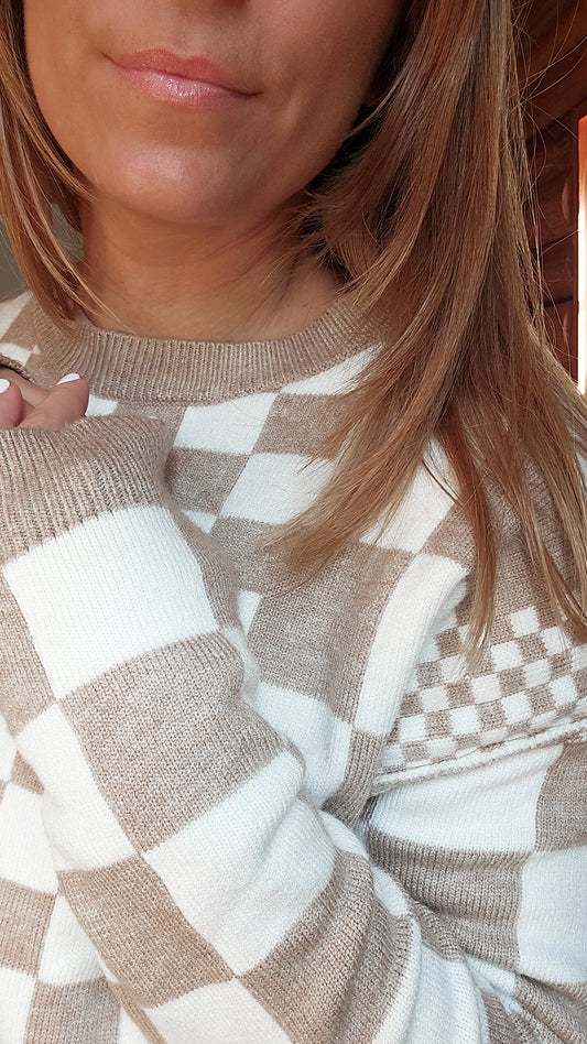 Khaki Checkered Print Drop Shoulder Round Neck Sweater