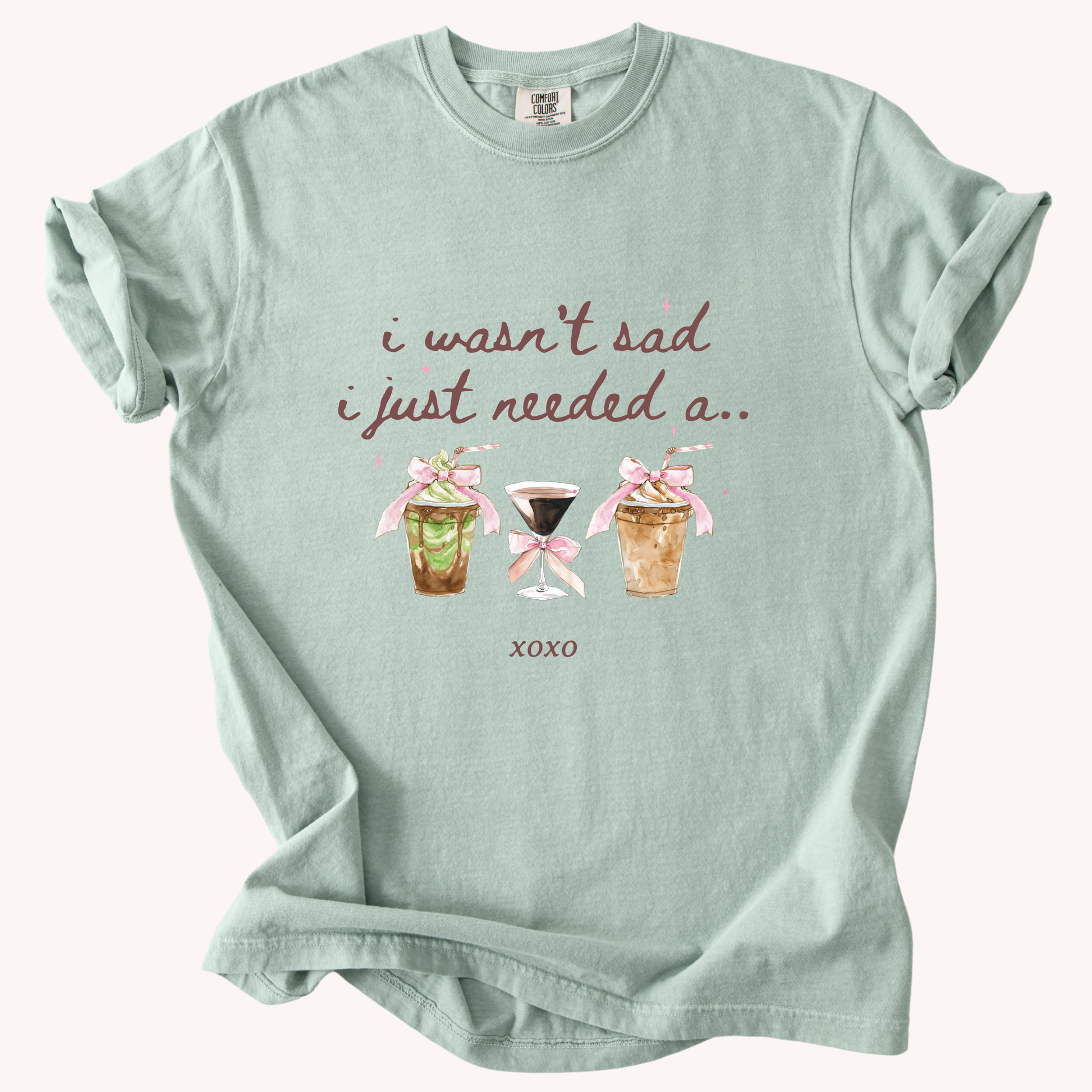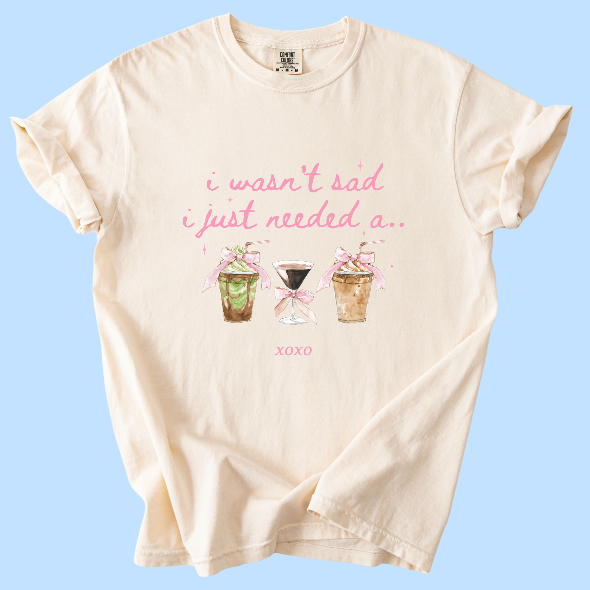 Soft, lived-in comfort with a gentle sense of humor. This garment-dyed cotton tee settles into your wardrobe like an old friend — relaxed, substantial, and easy to wear. The front art shows three sweet, watercolor-style beverage cups with a handwritten line above: “i wasn't sad i just needed a…”, giving the shirt a playful, cozy vibe that lands somewhere between Sunday brunch and late-night chats. Wear it with jeans and a mug in hand, or layered under a cardigan when the morning feels slow. The muted, garment-dyed color and heavyweight knit give the print a warm, blended look that ages beautifully with each wash.